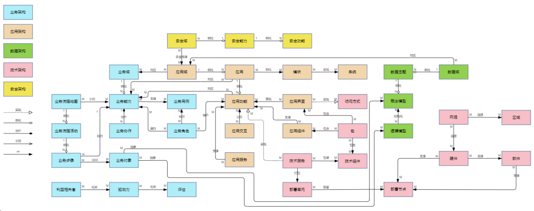 架構元模型是企業(yè)的標準、規(guī)范、指引,是進行架構設計的基礎。架構元模型包括架構對象和對象關系,其中架構對象決定架構有哪些元素可以設計,是元模型的核心部分。