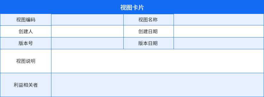 視圖卡片·清晰描述關系視圖卡片是關于視圖元信息的描述,通過視圖卡片可以了解視圖編碼、名稱、版本號、創(chuàng)建人、視圖描述和視圖的利益相關者。