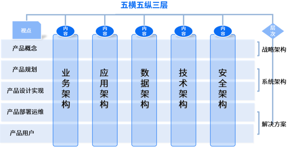 五縱,即縱向包括的五大架構設計——業(yè)務架構、應用架構、數(shù)據架構、技術架構、安全架構。