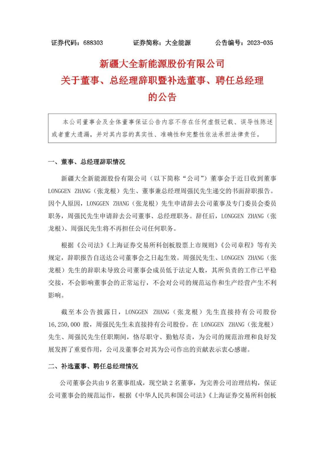 新疆大全新能源股份有限公司(以下簡稱“大全能源”)董事張龍根、董事兼總經(jīng)理周強(qiáng)民辭職。