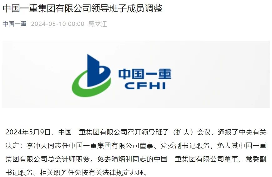 5月9日,中國一重集團有限公司召開領導班子(擴大)會議,通報了中央有關決定:李沖天同志任中國一重集團有限公司董事、黨委副書記職務,免去其中國一重集團有限公司總會計師職務。免去隋炳利同志的中國一重集團有限公司董事、黨委副書記職務。相關職務任免按有關法律規(guī)定辦理。