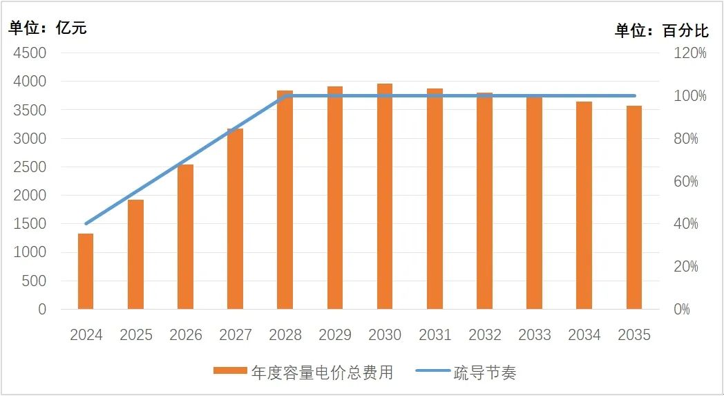 圖2 年度容量電價(jià)總費(fèi)用及疏導(dǎo)節(jié)奏(按趨勢(shì)預(yù)估測(cè)算)