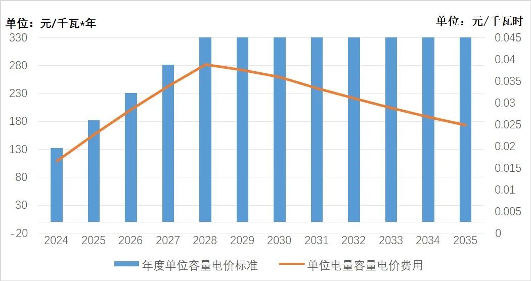 圖3 年度單位容量電價(jià)標(biāo)準(zhǔn)及單位電量容量電價(jià)費(fèi)用(按趨勢(shì)預(yù)估測(cè)算)