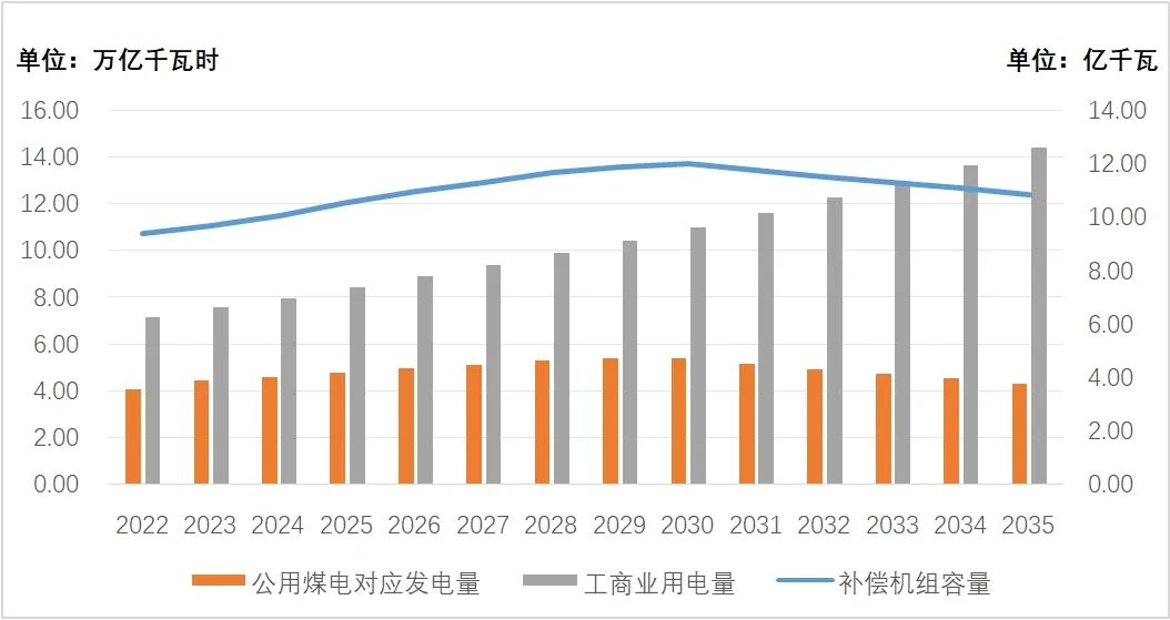 圖1 公用煤電對(duì)應(yīng)發(fā)電量及工商業(yè)用電量、補(bǔ)償機(jī)組容量預(yù)測(cè)趨勢(shì)(未來(lái)年度數(shù)據(jù)為作者個(gè)人分析預(yù)測(cè)值,其中煤電容量數(shù)據(jù)為年內(nèi)平均值而非期末時(shí)點(diǎn)值)