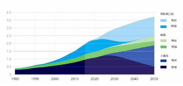 圖:全球不同類型和動(dòng)力系統(tǒng)的路面交通工具數(shù)量統(tǒng)計(jì)(單位:百萬(wàn)輛)