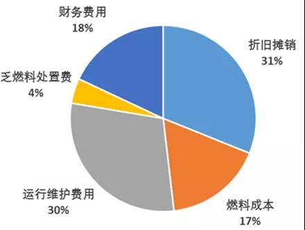 核電發(fā)電成本由折舊攤銷、燃料成本、運(yùn)行維護(hù)費(fèi)用、財務(wù)費(fèi)用、乏燃料處置費(fèi)用等組成(見圖2)。在電改背景下,核電上網(wǎng)面臨“量價齊跌”壓力,經(jīng)濟(jì)性提升壓力日益增大,并進(jìn)一步向上游傳導(dǎo)至核燃料加工產(chǎn)業(yè)。