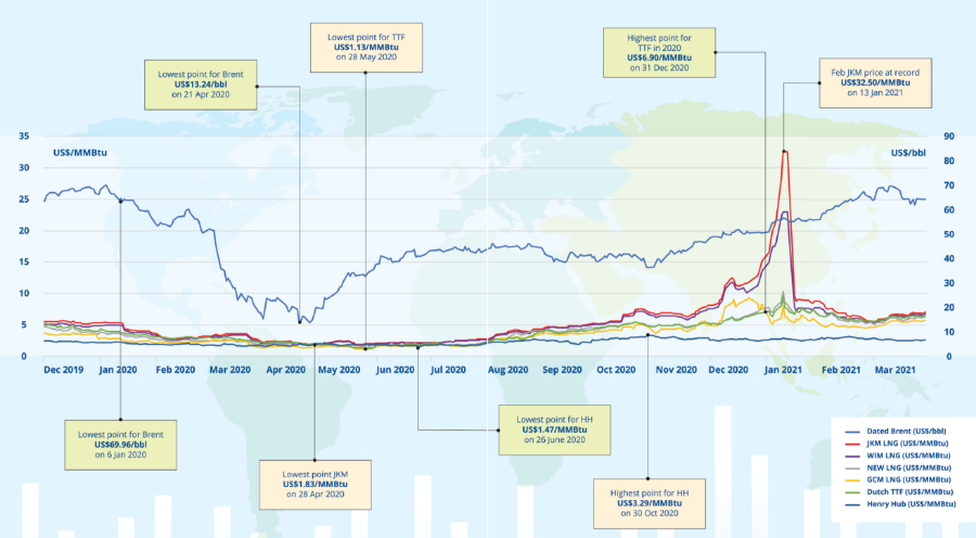 受疫情影響,2020年全球油氣供需嚴重失調,不僅WTI創(chuàng)造了歷史性的“負油價”,全球天然氣價格也緊隨其后,降至近十年來最低點。一直飽受“亞洲溢價”困擾的JKM定價與同期歐美氣價幾乎持平,最低至1.83美元/MMBtu。