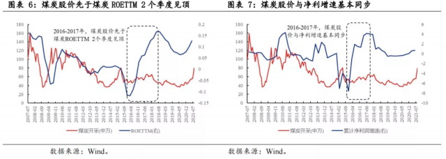 供給壓縮主導的煤炭價格上漲,股價與基本面相關性更高,累計凈利增速可能是更重要的觀測變量。2016-2017年煤炭股價的上漲與基本面基本同步,從時間維度來看,那輪行情中,煤炭股價提前于煤炭股ROE 2個季度見頂,2017年三季度至2018年三季度,煤炭股ROE持續(xù)上漲,但煤炭股價相對全A收益率卻為-6.14%。與之形成對比的是,2017年三季度煤炭股凈利潤增速與煤炭股價同步見頂,隨后的一年內(nèi)雖保持在70%以上的高位,但煤炭股價依舊下滑。