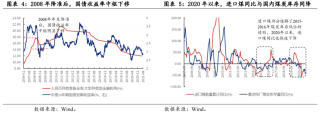與之形成對比的是2008年的煤炭行情,這輪行情主要由流動性和需求驅動,煤炭股與煤炭價格相關性相對較小。2008年10月至12月三次降準,國債收益率中樞明顯下移,流動性驅動下,煤炭股起步早于煤炭價格1個月,并且在煤炭股快速上漲期間,煤炭價格僅小幅上漲不足6%。