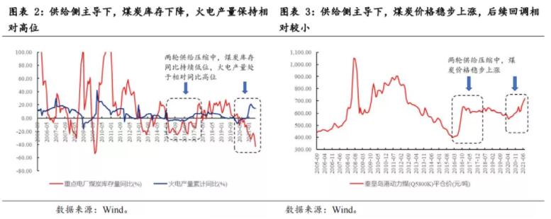 2008年以來,共有三輪煤炭價格持續(xù)上漲區(qū)間,第一輪的上漲動力是中國四萬億刺激政策落地,流動性和需求主導,第二輪為供給側改革,供給壓縮主導,第三輪為需求復蘇+供給壓縮主導。