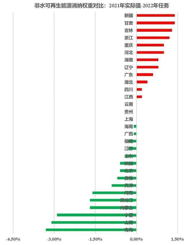 但從非水可再生能源消納權(quán)重對比看,2021年實(shí)際值和2022年的任務(wù)相比,新疆、甘肅、吉林、浙江、重慶、河北等地差距比較大,這些地方的風(fēng)光等可再生能源需要大力發(fā)展。