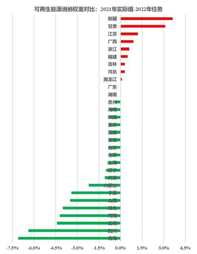 新疆、甘肅等少數(shù)省份,2021年的消納權(quán)重水平與2022年消納責(zé)任權(quán)重目標(biāo)距離較大,完成壓力大。在2021年的完成情況通報(bào)中,新疆、甘肅兩省也被點(diǎn)名批評。