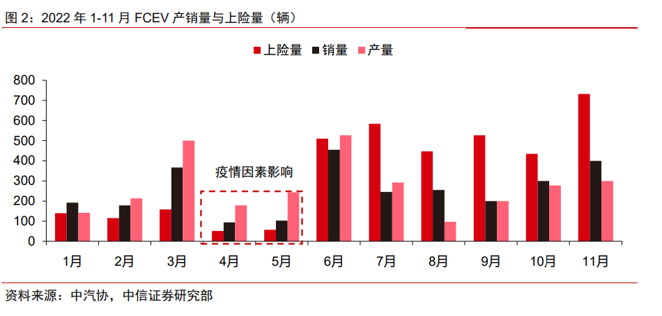 根據(jù)中汽協(xié)以及中信保數(shù)據(jù),2022年前11月FCEV產(chǎn)量為2969輛,銷量為2789輛,上險總數(shù)為3755輛。2022年上半年產(chǎn)量一直大于銷量,主要系2021年下半年確定燃料電池示范城市群政策,業(yè)內(nèi)熱情與預(yù)期較高。