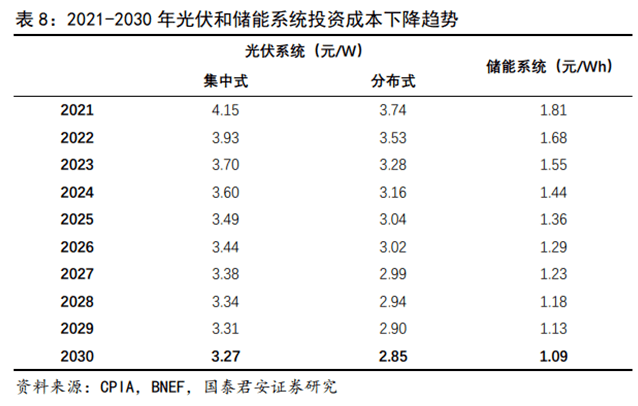 目前,各地依據(jù)本地情況出臺(tái)配儲(chǔ)比例政策,常見要求配儲(chǔ)10%、2h(0.2wh)。長期來看,配儲(chǔ)規(guī)模的增長彈性取決于光伏和儲(chǔ)能裝置成本的持續(xù)下價(jià),理論上是維持光儲(chǔ)一體化資產(chǎn)的合理IRR。我們按照2030年光伏和儲(chǔ)能的成本測(cè)算,配儲(chǔ)0.6wh的IRR可以達(dá)到6%。