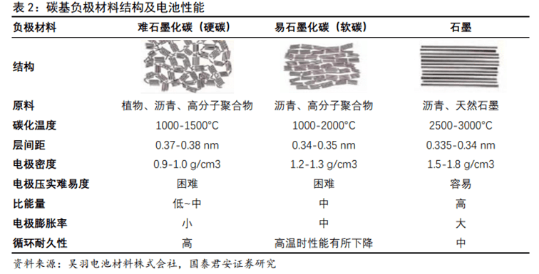 硬碳占據(jù)負極主流,改善首周循環(huán)效率為商業(yè)化關鍵。硬碳材料由于高比容量(300 mAh/g左右)、低儲鈉電壓(平臺段電壓在0.1V左右)、長循環(huán)壽命、來源廣而被認為是鈉離子電池最具商業(yè)化潛力的負極材料。目前,商業(yè)化的鈉離子電池所使用的負極幾乎都是硬碳,硬碳比石墨更易合成。