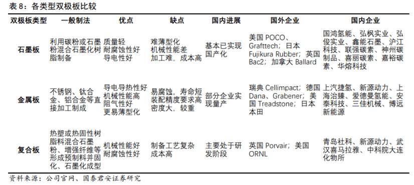 雙極板(BP):依材質(zhì)可分為石墨雙極板、金屬雙極板和復(fù)合雙極板。氫燃料電池目前主要采用石墨板或金屬板,釩液流電池傾向復(fù)合板。國產(chǎn)化進(jìn)程方面,石墨板基本已實(shí)現(xiàn)國產(chǎn)化,金屬板已有部分企業(yè)實(shí)現(xiàn)量產(chǎn),復(fù)合板尚處研發(fā)階段。