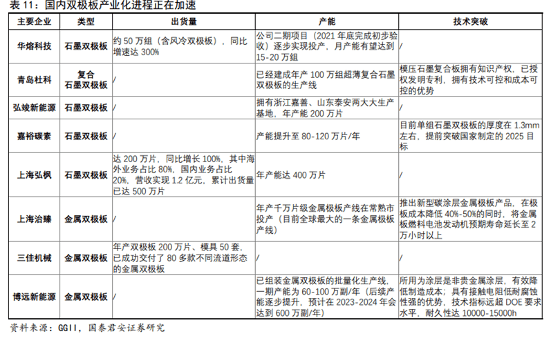 國內(nèi)產(chǎn)業(yè)化進(jìn)程正在加速:據(jù)GGII統(tǒng)計(jì),2021年期間,國內(nèi)主流雙極板企業(yè)出貨量增長顯著,金屬雙極板領(lǐng)域已出現(xiàn)單個(gè)企業(yè)單個(gè)客戶出貨達(dá)百萬片級別的現(xiàn)象;石墨板市場各家出貨也均有較大增長,表現(xiàn)明顯的是原萬片級出貨企業(yè)的出貨量級達(dá)到10萬片以上,頭部企業(yè)的出貨更是達(dá)到了50萬片/年以上。
