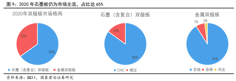 市場格局:仍以石墨板為主,金屬板或后來居上。氫燃料電池方面,2020年我國氫燃料電池雙極板市場規(guī)模達(dá)3.1億元,石墨板(包含碳塑復(fù)合板)和金屬板的市場占比分別為65%和35%,2021年石墨雙極板與金屬雙極板趨于平分秋色。GGII數(shù)據(jù)顯示,2021年H1金屬雙極板出貨量在雙極板總出貨量的占比已達(dá)45.0%(2020年同期為36.0%)。釩液流電池方面,基本不考慮金屬板,即使是涂層處理后的金屬板,在酸性液體環(huán)境中也難以長期穩(wěn)定工作。石墨雙極板(機(jī)加工)不被看好,因?yàn)槠錂C(jī)加工過程復(fù)雜且成本高。釩液流電池主要采用碳塑復(fù)合板,因?yàn)槠錈崴芑蚰汗に囅鄬C(jī)加工簡單,但是混合高分子樹脂所帶來的電阻率增加仍是需要解決的問題。