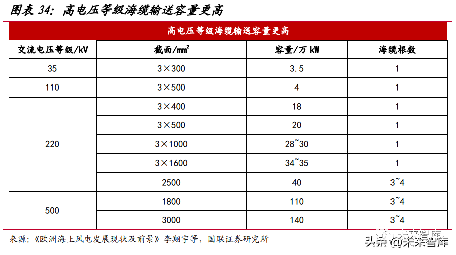 海纜對耐腐蝕、抗拉耐壓、阻水防水等性能要求更高。與陸纜相比,海纜鋪設(shè)于 海底,水下情況復(fù)雜,需要承受較大水壓,因此必須具有良好的阻水和機械性能,防 止水分滲透導(dǎo)致海纜發(fā)生故障,也需要具備良好的機械性能為、防止船只錨害和洋流 沖刷,此外海纜還需具有防腐蝕、防海洋生物的能力,保障壽命。海纜趨勢一:離岸距離、大兆瓦風(fēng)機驅(qū)動使用高電壓等級海纜。過去國內(nèi)已并網(wǎng) 的海上風(fēng)電項目離岸距離較近(30km 以內(nèi)),均采用交流海纜送出方式,但隨著風(fēng)機 大型化、項目向深遠海延伸過去,35kV、110kV 交流海纜受輸送容量限制,同時鋪設(shè) 海纜根數(shù)多對海底走廊有很高占用,輸電損耗也較大。同輸電功率的情況下,電壓越高電流就越小,高壓輸電能減少輸電時的電流從而降低因電流產(chǎn)生的熱損耗和降低遠 距離輸電的材料成本。國內(nèi)目前主流交流海纜電壓等級為 220kV,采用單回三芯結(jié)構(gòu), 輸電能力在 18~35 萬 kW,高電壓等級(更高 220kV、500kV)輸電能力顯著提高。