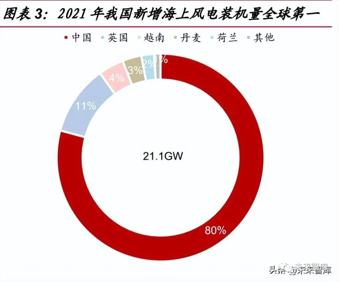 根據(jù) GWEC(全球風(fēng)能協(xié)會)披露,2021 年我國新增風(fēng)電裝機容量為 47.6GW, 占全球總風(fēng)電新增裝機容量的 51%。海上風(fēng)電方面,海上風(fēng)電新增裝機量與累計裝 機量均位列全球第一。