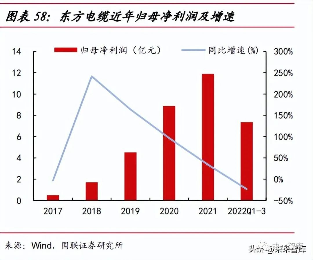 產(chǎn)能布局鞏固龍頭地位,在手訂單飽滿。公司積極布局南方市場,位于北侖和陽 江的兩大基地,有望助力公司提升在浙江、廣東等地區(qū)的優(yōu)勢。截至 2022 年 10 月27 日,公司在手訂單 94.4 億元,其中海纜系統(tǒng) 58.1 億元,陸纜系統(tǒng) 23.7 億元、海 洋工程 12.7 億元,同比增加 48%。在手訂單結(jié)構(gòu)中,毛利率較高的海洋板塊占比提 升明顯,未來公司盈利能力有望隨著產(chǎn)品結(jié)構(gòu)改善以及海纜需求回暖迎來提升。我們預(yù)計 2022-24 年公司歸母凈利潤分別為 9.61/18.86/23.44 億元(原值為 12.68 /17.46/23.38 億 元 ), 同 比 -19.18%/96.34%/24.26% , EPS 分 別 為 1.40/2.74/3.41 元/股。