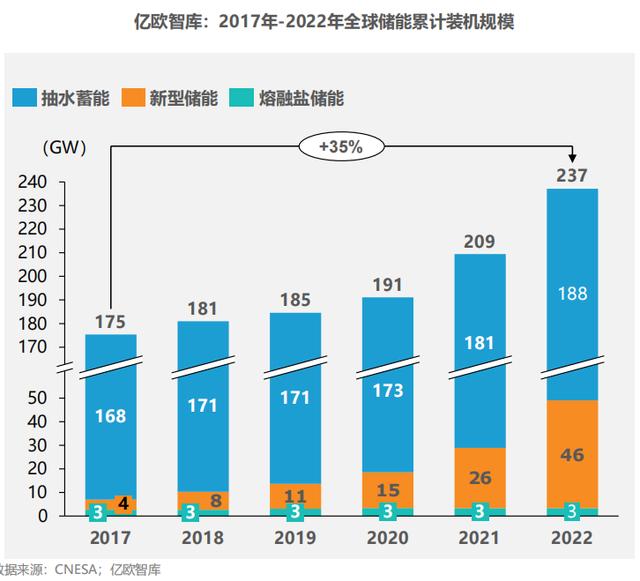 根據(jù)CNESA數(shù)據(jù),截至2021年底,全球已投運的(電力)儲能項目累計裝機規(guī)模 209.4GW,相較于五年前增長19%。抽水蓄能占比高,漲幅較小;儲能的增長幾乎全部來自于新型儲能,五年間占比已達(dá)12.2%。其中電化學(xué)儲能為增長主力軍,從2017年的2.9GW增長至如今的23GW,占據(jù)新型儲能市場90%以上的份額。