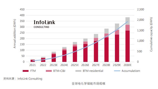 根據(jù)InfoLink資料庫統(tǒng)計,2022年全球電化學(xué)儲能新增16.2GW/44GWh,其中以中國新增約34%占整體成長速度最快,其次為美國、歐洲、日本、韓國、澳大利亞等,光是上述國家2022年儲能新增總和占全球超過市場九成份額,因此累計至2022年底,電化學(xué)儲能全球累計安裝量為41GW/98.8GWh,之中約有16-17GWh搭配光伏系統(tǒng),InfoLink估計光加儲占比將會因政策及再生能源發(fā)展而逐年提升比重,此外,盡管現(xiàn)在儲能增長速度每年已經(jīng)以倍數(shù)成長,估計到2025年國際電芯廠紛紛擴產(chǎn)之后,儲能系統(tǒng)會因電池價格下降因而再加速建置速度,預(yù)計2025年全球電化學(xué)儲能市場有望超過100GWh,而2030年全球樂觀有望累積建置 250GWh。