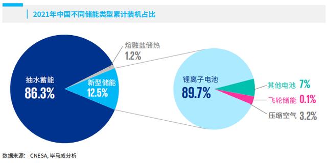 根據(jù)CNESA數(shù)據(jù),2021年中國儲能市場中不同類型儲能方式的占比與全球基本保持一致。其中抽水蓄能仍是最主要的儲能方式,占比86.3%,與全球86.2%的占比持平;但抽水蓄能電站的建設(shè)受地形因素限制較大,且建設(shè)周期較長,通常需要7年左右,未來隨著電化學(xué)儲能等新型儲能造價的下降,抽水蓄能在電力系統(tǒng)中的發(fā)展空間可能受限。新型儲能方式占比12.5%,高于全球0.3個百分點。電化學(xué)儲能為最主要的新型儲能方式,占比96.7%,比全球占比略低一個百分點,鋰離子電池占據(jù)主流。