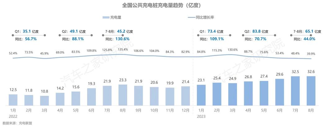 從公樁使用情況上看,隨著新能源汽車保有量的快速增長(zhǎng),公樁充電量持續(xù)增長(zhǎng),今年1-8月充電量已超過(guò)去年全年充電量之和。今年新能源汽車銷量持續(xù)高漲,滲透率不斷提高,隨之帶來(lái)的是新能源用車出行需求快速增長(zhǎng),使得全國(guó)公共充電樁充電量在7、8兩個(gè)月內(nèi)連續(xù)超越30億度大關(guān)。