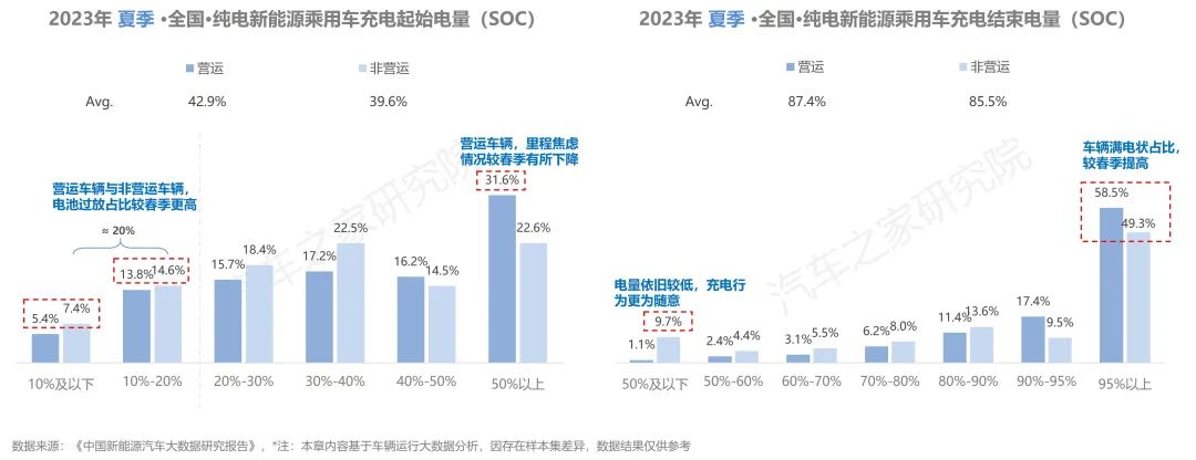從充電開始電量上看,在夏季營(yíng)運(yùn)與非營(yíng)運(yùn)車輛均有相當(dāng)比例的車輛存在電池過(guò)放有害電池健康的現(xiàn)象,這一情況的比例較春季明顯增加。同時(shí),在剩余電量在50%以上就開始充電的車主數(shù)量較春季有明顯下降,營(yíng)運(yùn)車輛與家用車輛車主對(duì)里程焦慮感有所減弱。