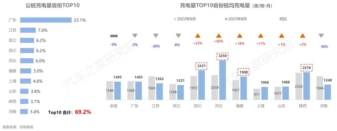 從各省份充電量上看,廣東省擁有全國(guó)22%的公共樁,充了全國(guó)23.1%的電量,在充電量方面同樣成為當(dāng)之無(wú)愧的王者。