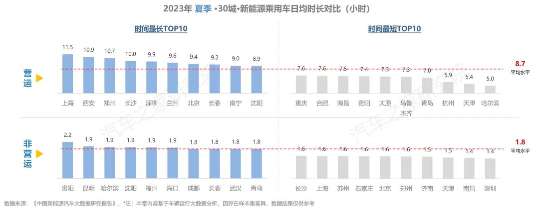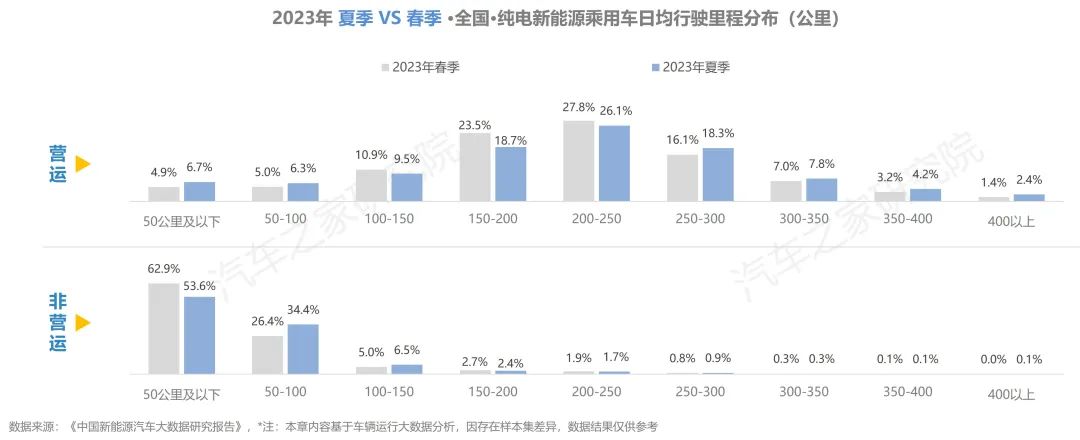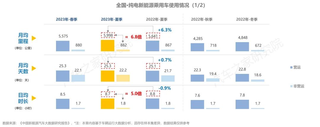 與去年同期相比,純電車輛在行駛里程有所增加,在出行天數(shù)與行駛時(shí)長(zhǎng)方面,同去年夏季相比大體持平。而從不同車輛性質(zhì)對(duì)比上看,營(yíng)運(yùn)車輛的使用強(qiáng)度遠(yuǎn)超非營(yíng)運(yùn)車輛,兩者在行駛里程方面相差超6倍,在日均時(shí)長(zhǎng)則亦有近5倍的差距。