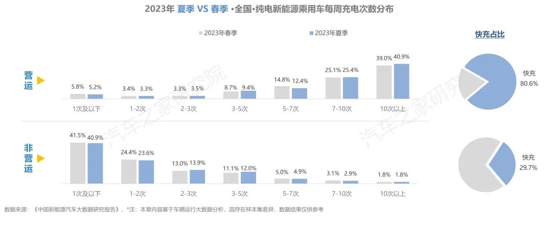 純電營(yíng)運(yùn)車輛每周充電超過(guò)7次的占比超過(guò)60%,且在所有的補(bǔ)能行為中,使用快充的占比高達(dá)80%。非營(yíng)運(yùn)車輛中超四成的車輛,每周僅充電1次,選擇快充方式補(bǔ)能的占比不足30%。
