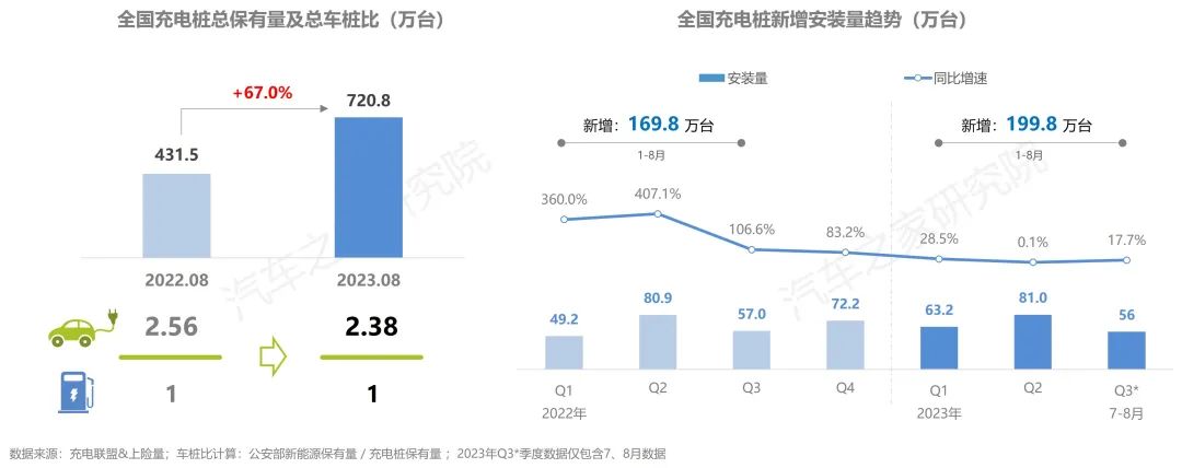 截止2023年8月,全國(guó)充電基礎(chǔ)設(shè)施累計(jì)數(shù)量為720萬(wàn)臺(tái),同比增加67.0%,車樁比為2.38,較去年同期與今年二季度的2.43均繼續(xù)下降。從充電設(shè)施建設(shè)上看,今年1-8月,充電樁新增安裝近200萬(wàn)臺(tái),新增安裝數(shù)量超越去年同期,7-8月充電樁安裝56萬(wàn)臺(tái),與今年二季度相比增速再次抬頭。