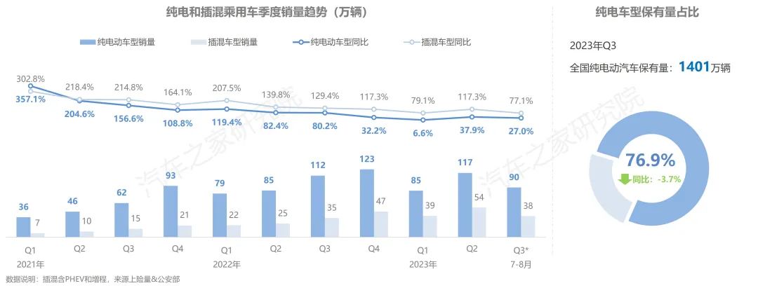 從新能源市場(chǎng)發(fā)展的趨勢(shì)上看,隨著技術(shù)的日漸成熟與明星車型的不斷涌現(xiàn),插混及增程車型的市場(chǎng)銷量增速長(zhǎng)期處于領(lǐng)跑位置,純電車型市場(chǎng)增速相對(duì)較弱。而從絕對(duì)增量與存量?jī)蓚€(gè)角度上看,新能源市場(chǎng)的大部分份額仍由純電車型所占據(jù),但市場(chǎng)正處于被緩慢的蠶食之中,目前全國(guó)純電動(dòng)汽車保有量為1400萬(wàn)輛,占全部新能源車保有量的近77%。