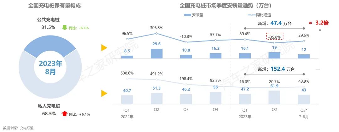 從結(jié)構(gòu)上看,私樁是目前新能源汽車補(bǔ)能的主要方式,占據(jù)充電樁近7成的保有量,而且發(fā)展增速更快。2023年1-8月,公共充電樁新增安裝47.4萬(wàn)臺(tái),7-8月安裝12萬(wàn)臺(tái),新增安裝量已超過(guò)去年整體Q3增量規(guī)模,恢復(fù)上行態(tài)勢(shì),但其增量水平與整體規(guī)模,同私人充電樁規(guī)模相比差距增大。