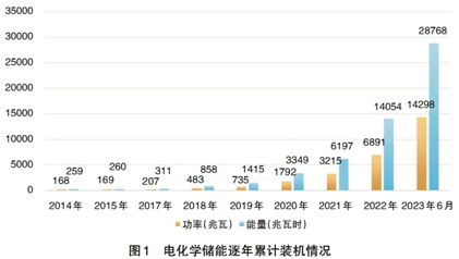 近年來,電化學儲能呈現(xiàn)爆發(fā)式增長,根據(jù)《統(tǒng)計數(shù)據(jù)》,2023年上半年,新增投運電化學儲能電站227座、總功率7.41吉瓦、總能量14.71吉瓦時,新增規(guī)模創(chuàng)歷史新高,超過此前歷年累計裝機規(guī)??偤?見圖1)。此外,目前在建電化學儲能電站325座、總功率12.92吉瓦、總能量30.49吉瓦時,按照電化學儲能電站建設周期一般6~8個月計算,在不計新增項目的情況下,2023年下半年新增裝機規(guī)模也將翻一番,提前兩年完成“十四五”規(guī)劃裝機目標(國家發(fā)改委、國家能源局《關于加快推動新型儲能發(fā)展的指導意見》中提到,2025年新型儲能裝機規(guī)模達3000萬千瓦以上)。