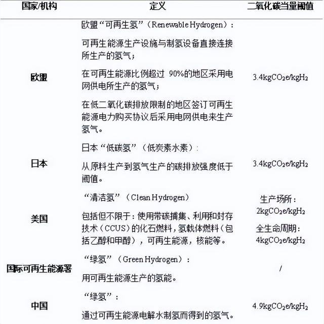 2020年12月29日,國內(nèi)行業(yè)組織提出《低碳?xì)?、清潔氫與可再生能源氫的標(biāo)準(zhǔn)與評價》,當(dāng)中指出在單位氫氣碳排放量方面,低碳?xì)涞拈撝禐?4.51千克二氧化碳當(dāng)量/千克氫,清潔氫和可再生氫的閾值為4.9千克二氧化碳當(dāng)量/千克氫,同時可再生氫要求其制氫能源為可再生能源。