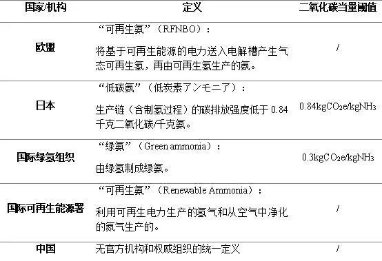 目前,國內(nèi)關(guān)于“綠氨”尚無官方機(jī)構(gòu)和權(quán)威組織的統(tǒng)一定義。行業(yè)內(nèi)具備相關(guān)發(fā)聲,國內(nèi)企業(yè)對綠氨的定義主要關(guān)注其原料氫是否由可再生能源電力制取,對生產(chǎn)過程中的碳排沒有明確的要求。