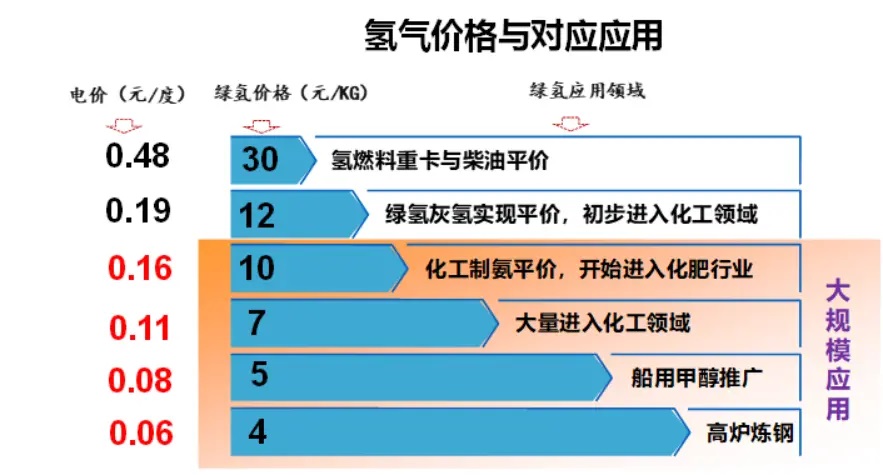 當(dāng)光伏電價降到0.19元每度時,對應(yīng)的綠氫價格是12元每公斤,這個時候的綠氫價格跟最便宜的煤制氫價格打平,一些單獨(dú)需要?dú)錃獾幕ち鞒?,可以選擇綠氫,雖然整體應(yīng)用并不多。
