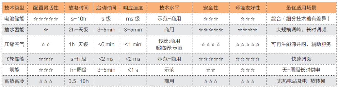 綜合分析各類儲(chǔ)能的技術(shù)特點(diǎn),從配置靈活性上看,電池儲(chǔ)能配置靈活性及可擴(kuò)展性最為優(yōu)異,抽水蓄能及傳統(tǒng)洞穴式壓縮空氣配置靈活性最差;從儲(chǔ)能發(fā)電時(shí)長上看,氫能發(fā)電時(shí)間可達(dá)周級(jí),抽水蓄能及傳統(tǒng)洞穴式壓縮空氣次之,電池儲(chǔ)能放電時(shí)間基本在s-10h之間;從啟動(dòng)及響應(yīng)速度上看,飛輪、超級(jí)電容和電池儲(chǔ)能技術(shù)基本在ms-s級(jí)別,適用于快速響應(yīng)的調(diào)頻領(lǐng)域;從安全性上看,機(jī)械儲(chǔ)能安全性最為優(yōu)異,電化學(xué)儲(chǔ)能的安全性相對(duì)較弱。