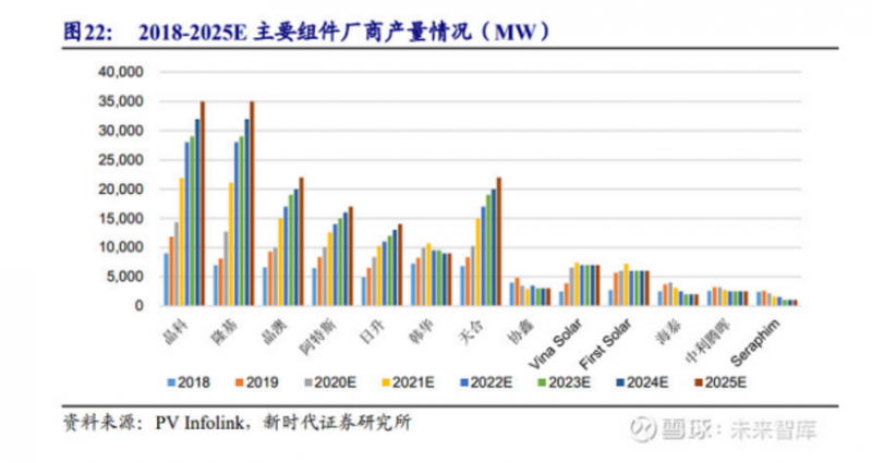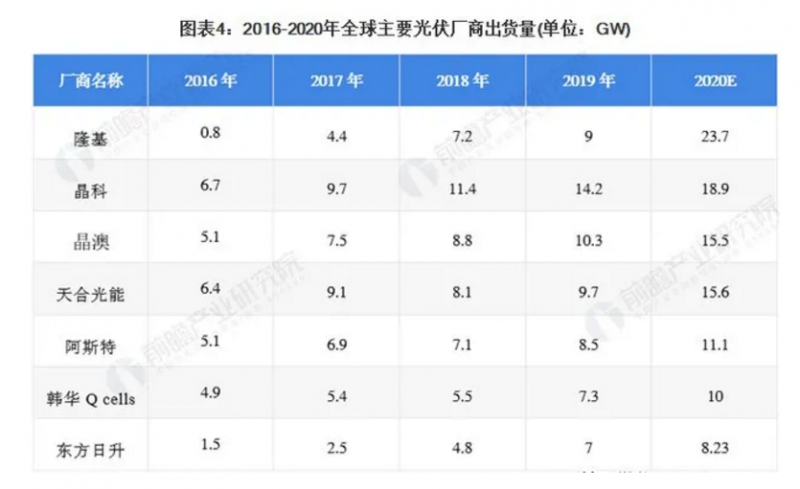 圖表2:我國光伏組件發(fā)展階段2016-2020年,全球主要廠商的組件出貨量不斷提升。2020年,隆基股份組件出貨量約為23.7GW,同比2019年增長163.33%,躍升至行業(yè)首位。同時,晶科、晶澳等龍頭組件廠商的出貨量也實現(xiàn)了超過30%的增長。廠商擴張產(chǎn)能主要為滿足下游光伏裝機容量的增加。