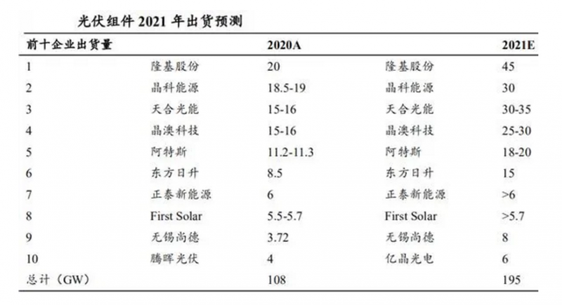 全球組件產(chǎn)能擴張迅速。據(jù)預(yù)測,2021 年全球光伏裝機量預(yù)計在 160~170GW 左右,以 1:1.2 容配比計算,對應(yīng)的組件總需求預(yù)計約為 192~204GW, 這意味著頭部企業(yè)的市占率目標(biāo)將超過 90%。根據(jù) BNEF 數(shù)據(jù),2020 年全球 Tier 1 組件產(chǎn)能約為 220GW,同比增長 31.7%。根據(jù) PV Infolink 及公司公告數(shù)據(jù)統(tǒng)計, 2021 年組件廠商產(chǎn)能預(yù)計約為 300GW,同比+33.76%,各家產(chǎn)能擴張迅速。