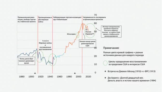 20世紀(jì)美國(guó)的兩次崛起可視為其積累周期、“漫長(zhǎng)世紀(jì)”的基礎(chǔ)。這兩次崛起基于兩次世界大戰(zhàn)及其戰(zhàn)后恢復(fù)期,這里值得注意的是,兩次大戰(zhàn)均發(fā)生于歐洲和亞洲,不在美國(guó)的領(lǐng)土之上。很大程度上,美國(guó)為這兩次在其領(lǐng)土之外進(jìn)行的戰(zhàn)爭(zhēng)和戰(zhàn)后重建提供了物資和技術(shù)(在擴(kuò)展自己產(chǎn)量的基礎(chǔ)上)。另一方面,在美聯(lián)儲(chǔ)的運(yùn)作下世界經(jīng)濟(jì)美元化的程度不斷加深??梢哉f(shuō),美國(guó)“漫長(zhǎng)世紀(jì)”基于其疆域以外的世界經(jīng)歷“破壞—重建”,循環(huán)往復(fù)。
