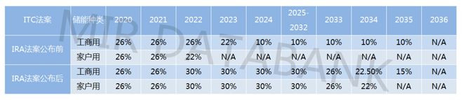 美國IRA法案出臺,獨(dú)立儲能納入ITC補(bǔ)貼范圍,并將ITC補(bǔ)貼有效期將持續(xù)到2033年,并將抵免劃分為基礎(chǔ)抵免+額外抵免。其中基礎(chǔ)抵免額度由之前的26%上升至30%,此前為逐年退坡。具體變化情況如下表:
