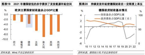 德國財政收支情況較好,為其應(yīng)對本輪能源危機沖擊奠定了基礎(chǔ)。2012年之后,德國財政盈余連續(xù)八年為正,直到2020年新冠疫情,德國財政盈余轉(zhuǎn)負,之后連續(xù)三年德國財政盈余均為負。2021年,德國的財政赤字為3.7%,2022年為2.6%,在歐洲主要國家中要高于荷蘭和葡萄牙,但遠低于意大利、英國等國家。德國較低的財政赤字為其提供多次發(fā)放能源補貼的操作空間。德國政府債務(wù)占GDP的比例在 2021年抬升至69.3%;但受高通脹影響,2022年德國名義GDP的同比增長高達7.4%,在一定程度緩解了杠桿率壓力,2022年德國政府債務(wù)占GDP的比例降至66.3%。