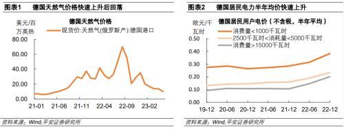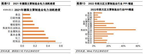 德國電力消耗密集型行業(yè)主要是紙制品、化工、基本金屬和非金屬制品等,也是工業(yè)品價格通脹較嚴(yán)重的行業(yè)。將行業(yè)電力消耗規(guī)模比上行業(yè)總產(chǎn)出,可以得到該行業(yè)的電力消耗密集度。德國紙制品行業(yè)的電力密集程度較高,每1歐元的產(chǎn)出需要投入0.51KWh的電力,化工、基本金屬和非金屬制品行業(yè)的電力密集度分別為0.4、0.36和0.33KWh/歐元。使用歐元區(qū)主要制造業(yè)PPI同比增速來衡量德國制造業(yè)的通脹形勢,可以看到2022年P(guān)PI同比最高的是焦炭和石油行業(yè),漲幅高達56.7%;電力消耗密集度較高的紙制品、化工、基本金屬和非金屬制品行業(yè)通脹程度也較高,其PPI同比分別為26.6%、29.9%、26.6%和16.7%。