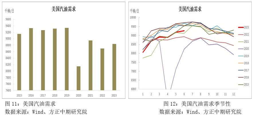 美國(guó)汽油消費(fèi)與美國(guó)汽車保有量及國(guó)內(nèi)汽車銷量的變化有直接關(guān)系,同時(shí)汽車銷售增量相應(yīng)領(lǐng)先于汽油需求增長(zhǎng)。2000年以后,美國(guó)國(guó)內(nèi)汽車銷量呈現(xiàn)明顯的下滑趨勢(shì),至2009年達(dá)到歷史低點(diǎn),此后保持增長(zhǎng)直至2014年,2015年以后美國(guó)汽車銷量再度出現(xiàn)下降,至今仍處在歷史低位水平。相應(yīng)的,美國(guó)汽油需求在2007年以后開(kāi)始下降,但隨著此后汽車銷量的增加,2012年以后美國(guó)汽油需求再度出現(xiàn)增長(zhǎng),但伴隨著美國(guó)汽車銷量的再度下降,在2017年年中美國(guó)汽油消費(fèi)達(dá)到峰值水平后,開(kāi)啟了緩慢下降趨勢(shì)。2023年上半年美國(guó)汽油消費(fèi)量達(dá)到884萬(wàn)桶/日,較2022年小幅增長(zhǎng)了14萬(wàn)桶/日,但較2019年下降了50萬(wàn)桶/日,降幅為5%。
