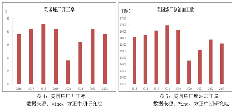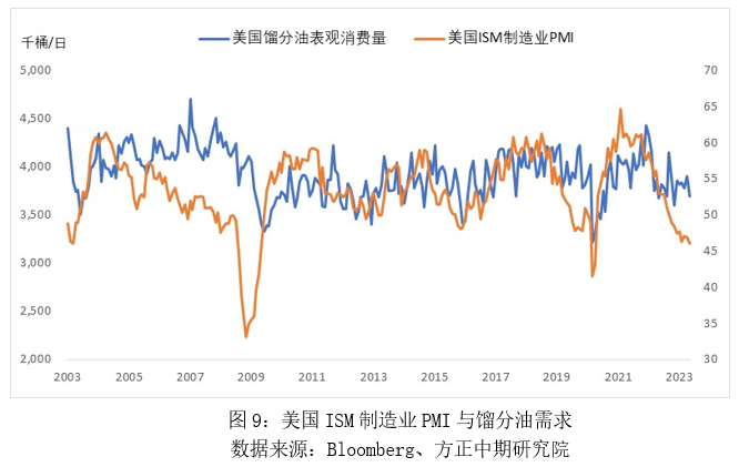 美國(guó)柴油消費(fèi)與美國(guó)制造業(yè)形勢(shì)息息相關(guān),通過(guò)對(duì)比發(fā)現(xiàn),美國(guó)餾分油需求與美國(guó)ISM制造業(yè)PMI趨勢(shì)基本保持一致,但存在滯后關(guān)系。其中,2008年金融危機(jī)以及2020年疫情均導(dǎo)致美國(guó)制造業(yè)PMI大幅下滑,并帶動(dòng)美國(guó)餾分油需求明顯走弱,但2021年美國(guó)制造業(yè)再度進(jìn)入下行周期,2022年美國(guó)餾分油需求也開(kāi)始走弱,2023年美國(guó)餾分油消費(fèi)量達(dá)到381萬(wàn)桶/日,較2022年下降了10萬(wàn)桶/日,較2019年下降了26萬(wàn)桶/日,降幅為6.5%。從歷史數(shù)據(jù)來(lái)看,排除極端情況,美國(guó)制造業(yè)變化往往要領(lǐng)先于美國(guó)餾分油需求變化近1年時(shí)間。