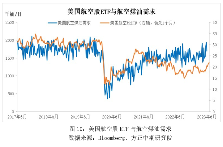 美國(guó)航空煤油消費(fèi)與美國(guó)航空業(yè)景氣度有緊密聯(lián)系。美國(guó)航空股ETF一定程度上能反應(yīng)美國(guó)航空業(yè)景氣度,2020年疫情導(dǎo)致航空出行需求驟降,美國(guó)航空業(yè)遭遇重挫,航空股ETF大幅走跌,相應(yīng)的,美國(guó)航空煤油消費(fèi)也顯著下降,而隨著美國(guó)出行限制的逐步放松,美國(guó)航空業(yè)景氣度也在逐步回升,進(jìn)而帶動(dòng)美國(guó)航空煤油快速回升,但2021年二季度以后,受經(jīng)濟(jì)環(huán)境低迷影響,美國(guó)航空股ETF再度走跌,直至2022年9月份才觸底回升,而在過(guò)去1年,美國(guó)航空煤油消費(fèi)整體也隨著美國(guó)航空業(yè)的進(jìn)一步恢復(fù)而走強(qiáng)。另外,我們從OAG的數(shù)據(jù)來(lái)看,當(dāng)前美國(guó)航空運(yùn)力已經(jīng)超過(guò)2019年同期水平約16%,同時(shí)2023年上半年美國(guó)航空實(shí)際客運(yùn)量也已經(jīng)回到疫情前水平,這對(duì)美國(guó)航空煤油消費(fèi)形成明顯支撐。2023年上半年美國(guó)航空煤油消費(fèi)量達(dá)到158萬(wàn)桶/日,較2022年小幅增長(zhǎng)了3萬(wàn)桶/日,但較2019年下降了20萬(wàn)桶/日,降幅為11%。